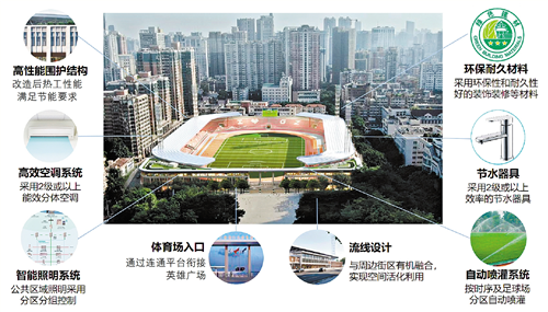 比如,如广州大学城体育中心攀岩场改造成为零碳场馆,广州天河体育中心体育场、深圳湾体育中心、深圳龙华文体中心改造成为近零碳场馆;广州大学城体育中心体育场、广东省人民体育场等一批场馆改造成为二星级绿色建筑。