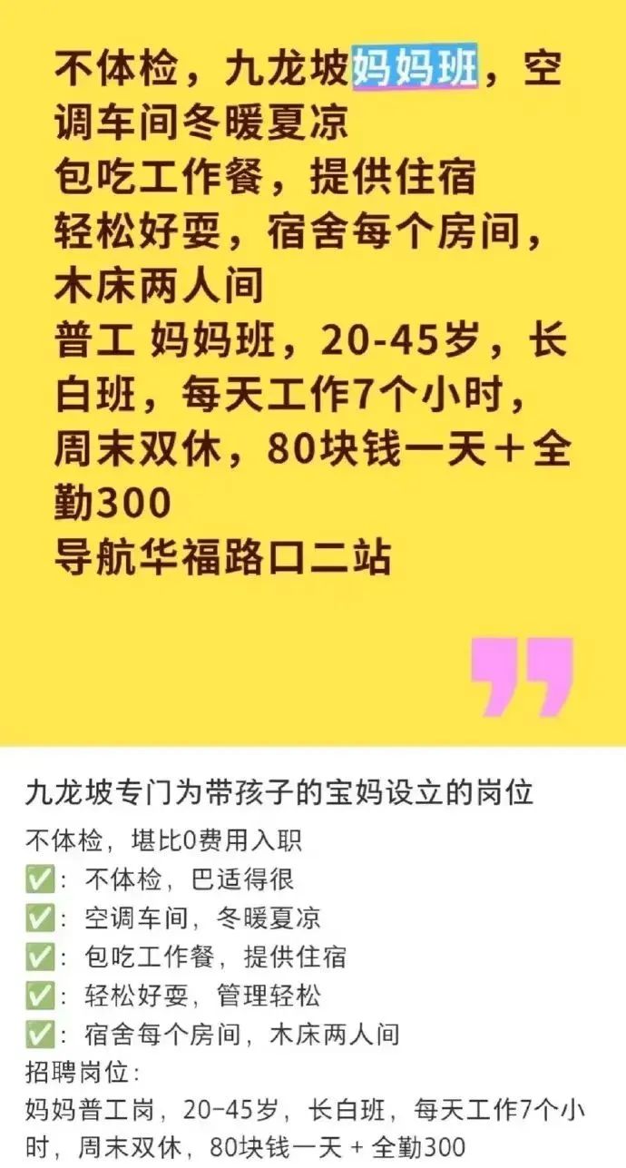 再翻看这些岗位提供的收入,更是深刻的反映了“同工不同酬”现象的普遍。江门一家沉香企业提供“日结+弹性工时”,日薪120元,月收入满打满算仅3600元左右;重庆九龙坡一家企业招的妈妈岗,日薪80元,需要每天工作7小时,工作强度并不低,时薪仅11元,而重庆的最低工资标准是一天107.13元,妈妈们看似能自由安排时间,可却要在更短的时间内完成更多的工作,还拿着更低的工资。