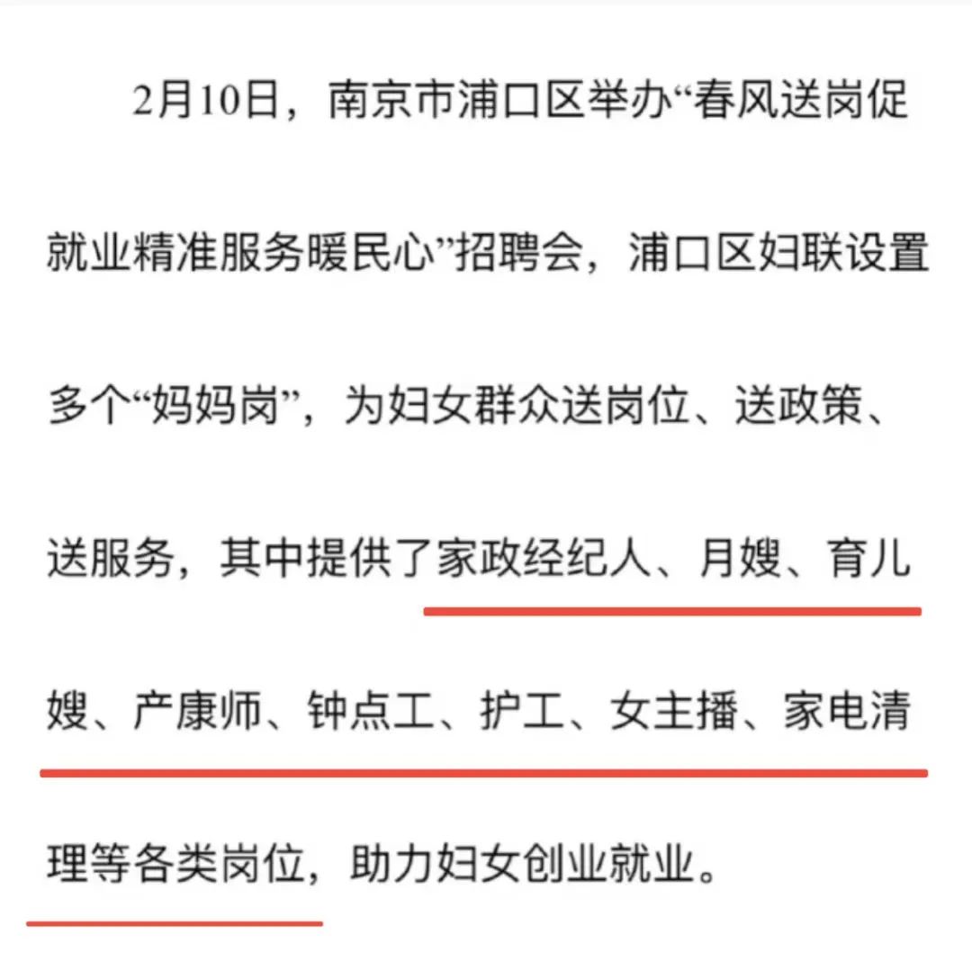 然而,初衷设定的有多丰满,现实就有多骨感。首先,妈妈岗能提供的岗位,往往是十分下沉的,据《中国新闻周刊》调查,在湖南、山东和广东等多省发布的“妈妈岗”名录中,近三分之一岗位集中在家政和清洁服务领域,其余多为客服、缝纫工等低技术含量工种,既缺乏晋升通道,薪资更是普遍低于市场水平。