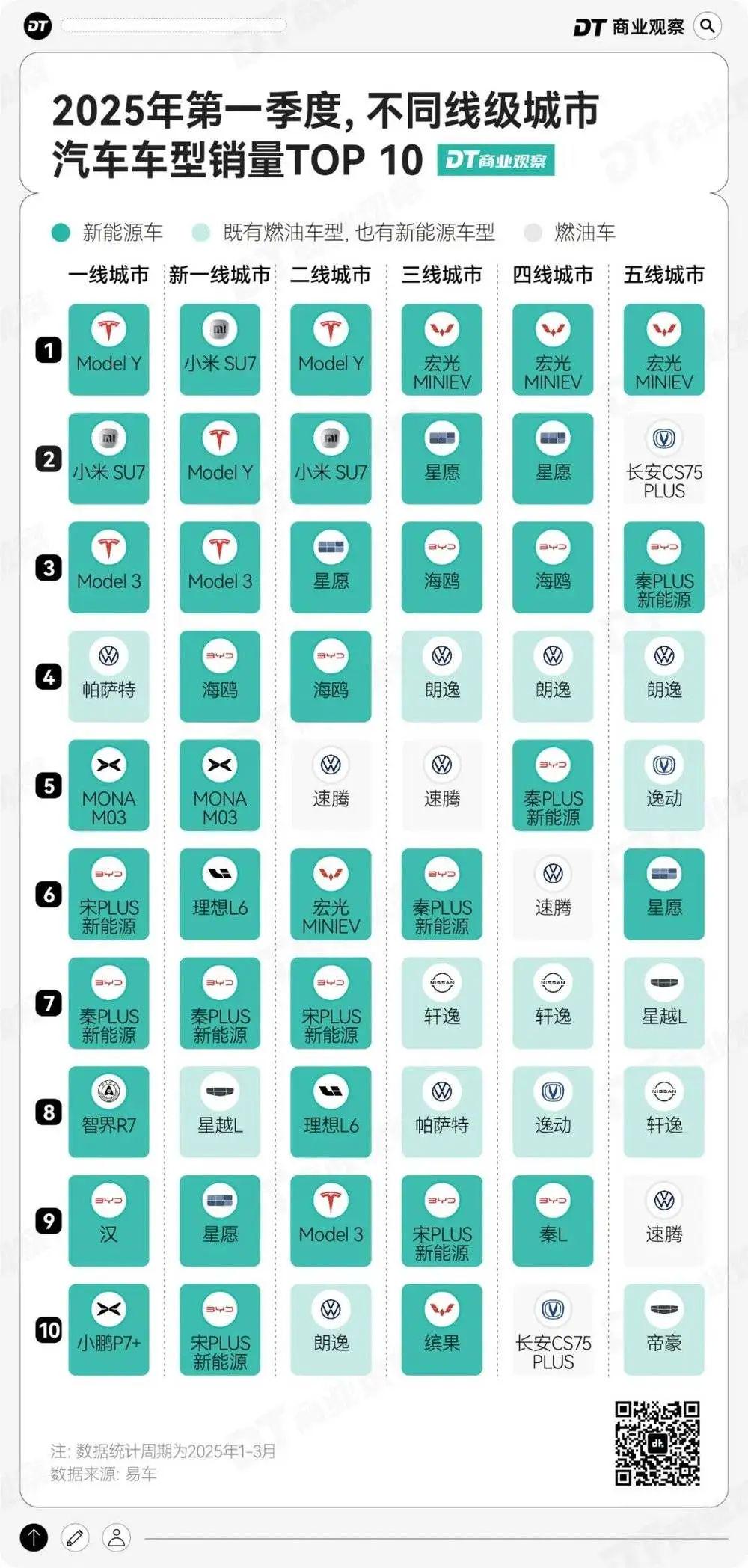 下沉市场的新能源热潮与差异,首先体现在了畅销车型的榜单上。根据易车榜发布的2025年1季度各线城市车型销量排名,不同线级人群对车型的喜爱程度展现出比较大的差异。