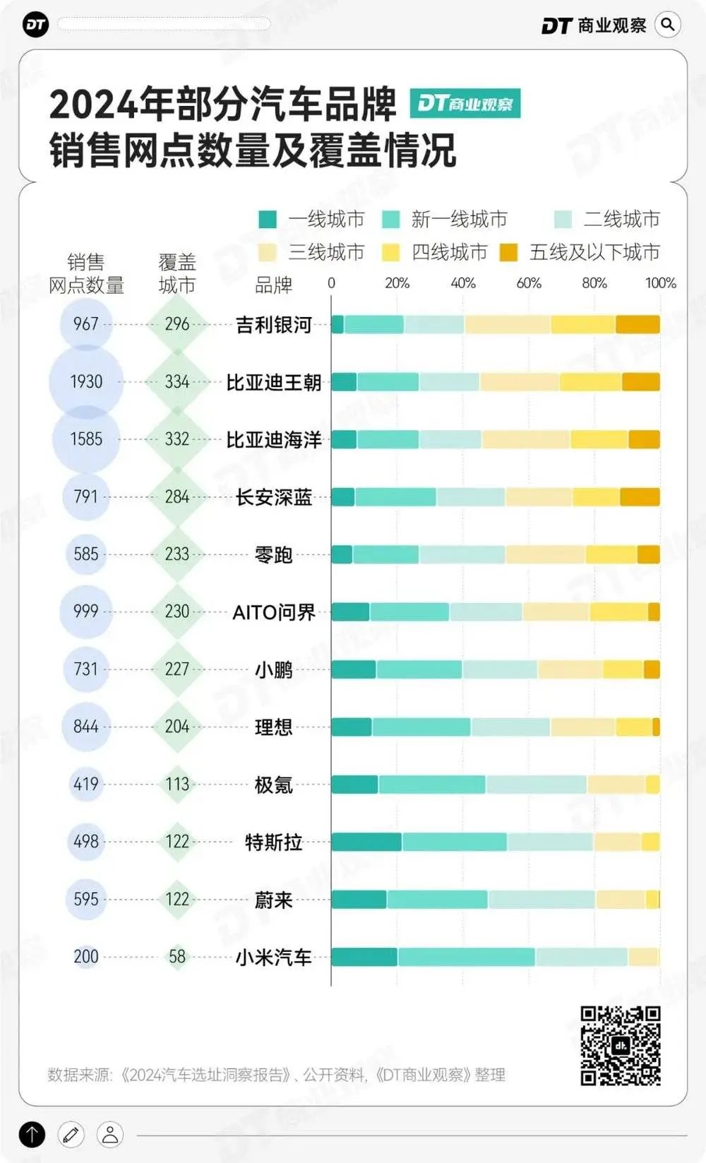 在这场“下乡大战”里,几个国产品牌冲在了前面。吉利银河、比亚迪王朝在三线及以下城市网点占比均超过了50%。