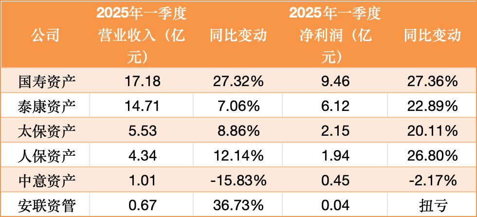 时代周报记者注意到,目前已有国寿资产、泰康资产、太保资产、人保资产、中意资产、安联资管6家机构披露2025年一季度业绩。其中,国寿资产净利大涨27.36%达9.46亿元,泰康资产、太保资产、人保资产净利增幅均超20%,安联资管成功扭亏。