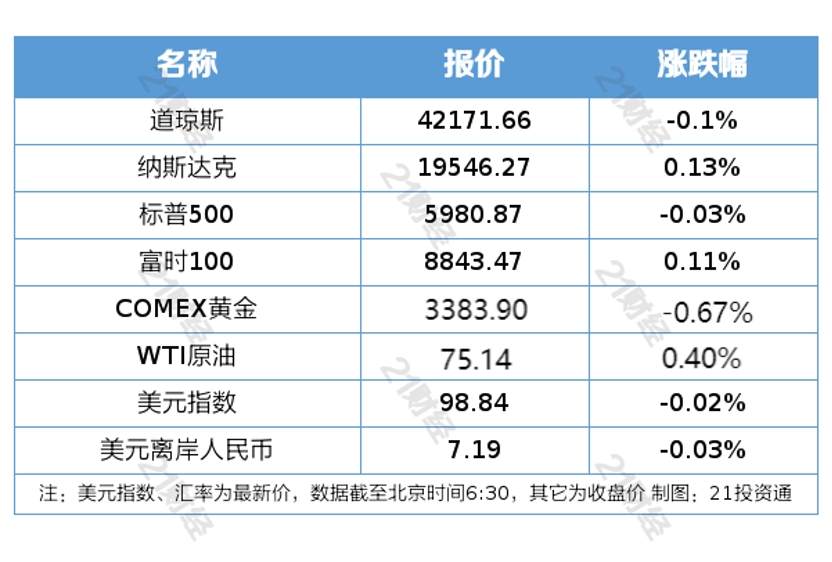 纽约股市三大股指6月18日涨跌不一。截至当天收盘,道琼斯工业平均指数比前一交易日下跌44.14点,收于42171.66点,跌幅为0.10%;标准普尔500种股票指数下跌1.85点,收于5980.87点,跌幅为0.03%;纳斯达克综合指数上涨25.18点,收于19546.27点,涨幅为0.13%。