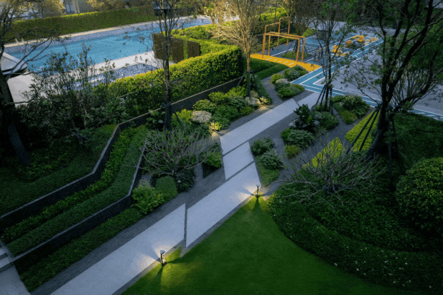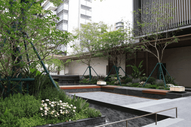 同时,社区内的景观园林也已投入使用。园林通过巧妙的路径设计,营造出曲径通幽的效果,形成递进的院落感;同时以简洁线条、多样植物和宁静水景,共同打造出雅致的景观会客厅,犹如把客厅搬进大自然。