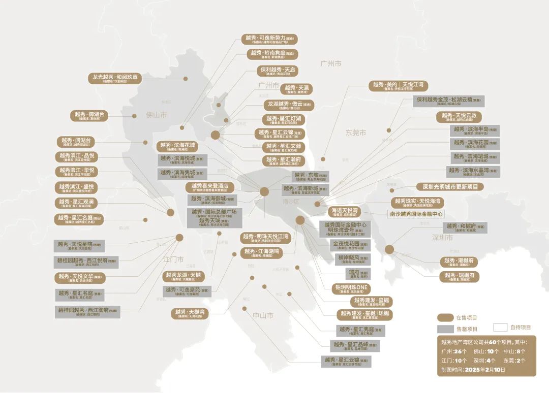 越秀地产湾区公司深耕广州、深圳、佛山等6座大湾区核心城市,累计开发项目60个,总建面约1380万平方米。