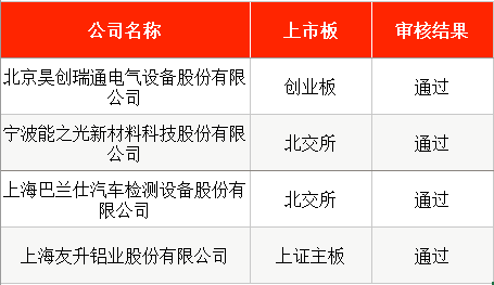 发审委审核方面,上交所、深交所、北交所上周均召开新一期上市审核委员会审议会议。其中,拟在创业板IPO的北京昊创瑞通电气设备股份有限公司(下称“昊创瑞通”),拟在北交所IPO的宁波能之光新材料科技股份有限公司(下称“能之光”)、上海巴兰仕汽车检测设备股份有限公司(下称“巴兰仕”),以及拟在上证主板IPO的上海友升铝业股份有限公司(下称“友升股份”),均成功过会。