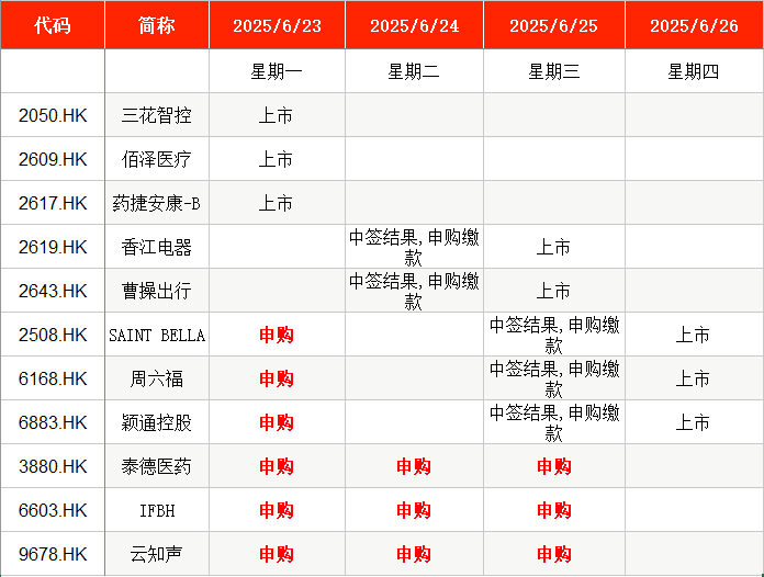 Wind数据显示, SAINT BELLA(02508.HK)、周六福(06168.HK)、颖通控股(06883)等均将于周一(6月23日)申购,泰德医药(03880.HK)、IFBH(06603.HK)、云知声(09678.HK)等则将于周一至周三(6月23日至6月25日)申购。