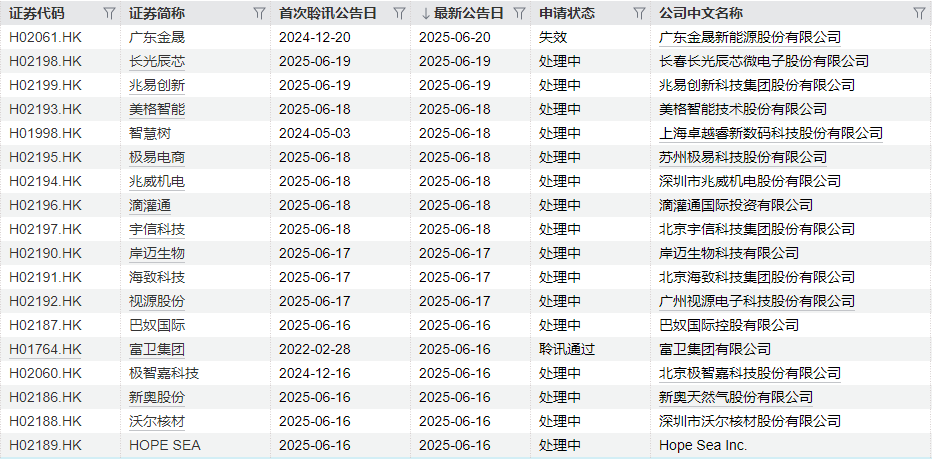 其中,长春长光辰芯微电子股份有限公司、兆易创新科技集团股份有限公司、美格智能技术股份有限公司、苏州极易科技股份有限公司、深圳市兆威机电股份有限公司、滴灌通国际投资有限公司、北京宇信科技集团股份有限公司、岸迈生物科技有限公司、北京海致科技集团股份有限公司、广州视源电子科技股份有限公司、巴奴国际控股有限公司、新奥天然气股份有限公司、深圳市沃尔核材股份有限公司、Hope Sea Inc.等14家公司为首次递交。