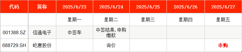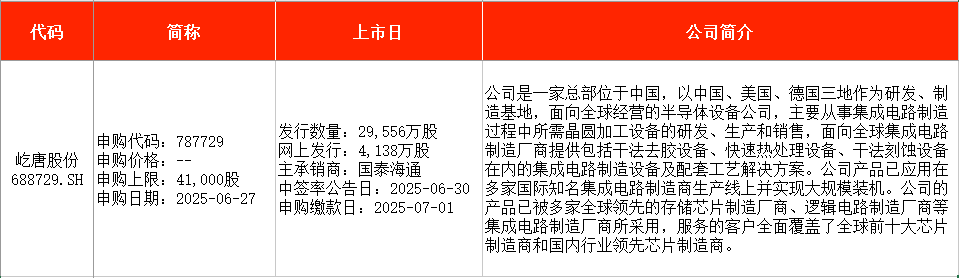 从时间表看,屹唐股份(688729)将在周五(6月27日)申购。