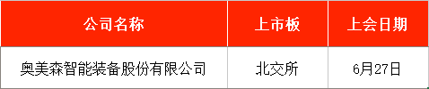 6月27日,北交所将审议奥美森智能装备股份有限公司(下称“奥美森”)的首发事项。奥美森是专业的智能装备制造生产商,主要从事智能生产设备及生产线的研发、设计、生产、销售。报告期内公司产品主要应用于工业产品的批量生产,下游行业包括空调制造、环保新能源及其他领域。