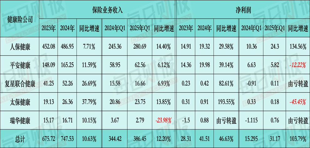 时间来到2025年,这五家专业健康险公司延续了去年高增长喜人势头,截至今年一季度末,五家公司合计实现保险业务收入386.45亿元,同比增长12.2%;合计实现净利润31.17亿元,同比大幅增长103.79%。