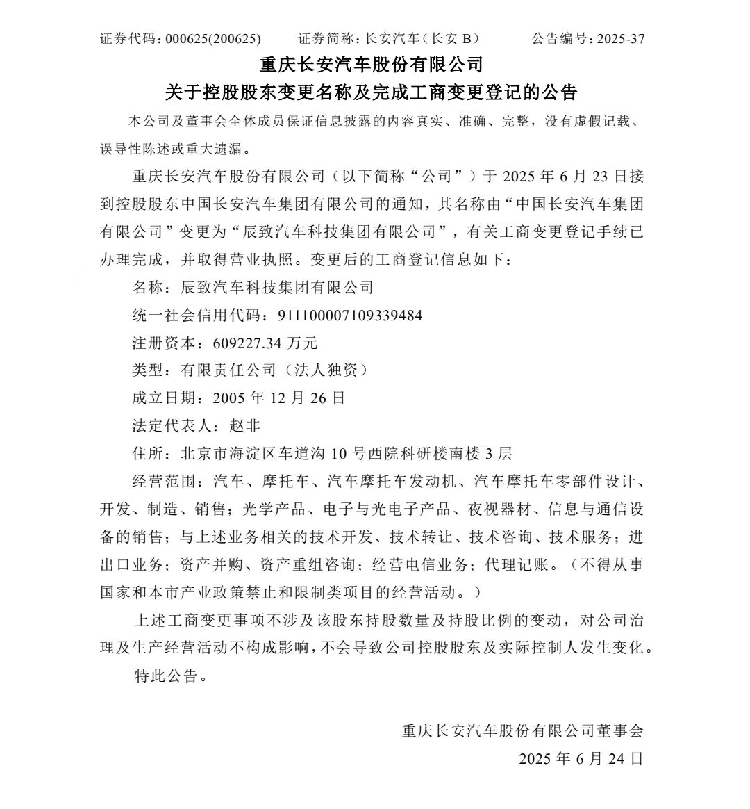 6月23日,长安汽车发布公告称,公司接到控股股东中国长安汽车集团有限公司通知,其名称由“中国长安汽车集团有限公司”变更为“辰致汽车科技集团有限公司”,并已完成工商变更登记手续。