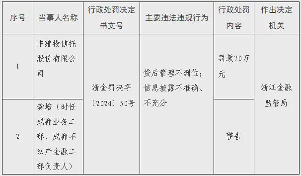 据国家金融监管总局对外披露,中建投信托因“贷后管理不到位,信息披露不准确、不充分”主要违法违规行为被浙江金融监管局处罚70万元。