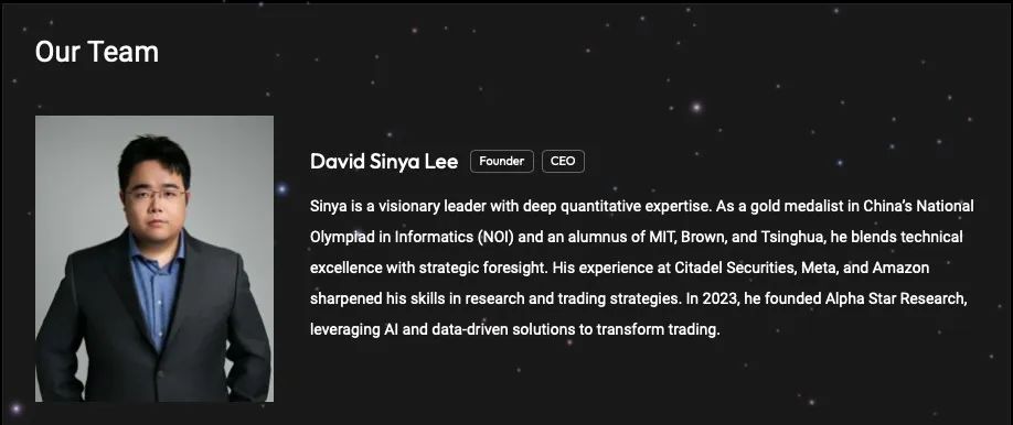 根据公开的个人资料,李新野曾获全国青少年信息学奥林匹克竞赛金牌和美国计算机奥赛第一名,毕业于清华大学“姚班”以及麻省理工学院、布朗大学的计算机科学专业,曾在亚马逊、Meta、Citadel Securities任职软件工程师,最近的职业更新显示他目前是Alpha Star Research的创始人兼CEO——这是一家关注人工智能基础研发并与量化金融相结合的金融科技公司。