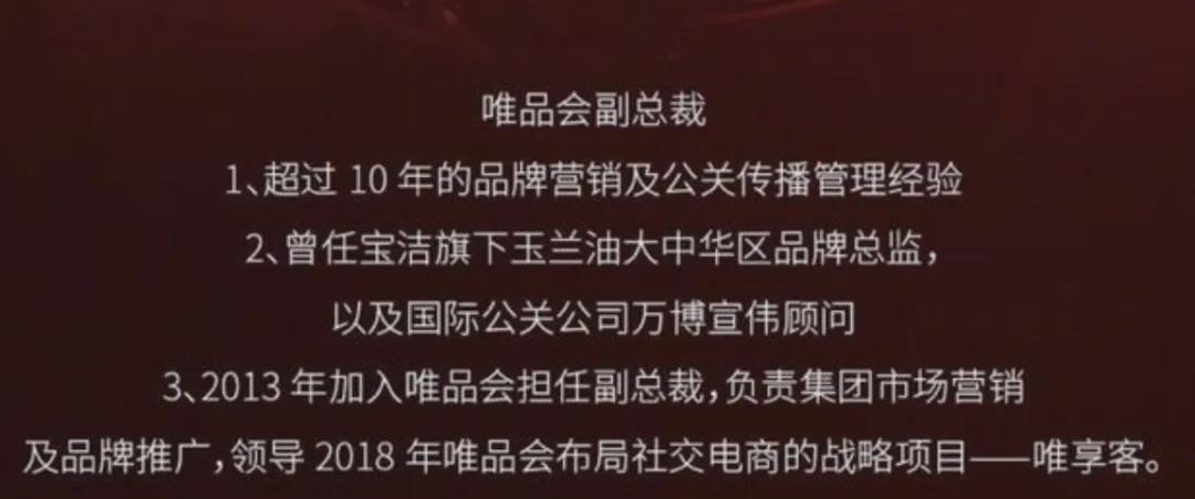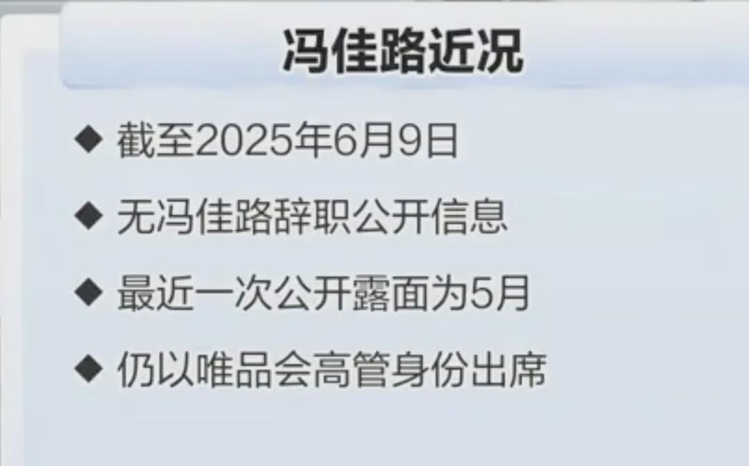 公开资料显示,冯佳路,是现任唯品会副总裁,负责品牌营销及公关传播工作。