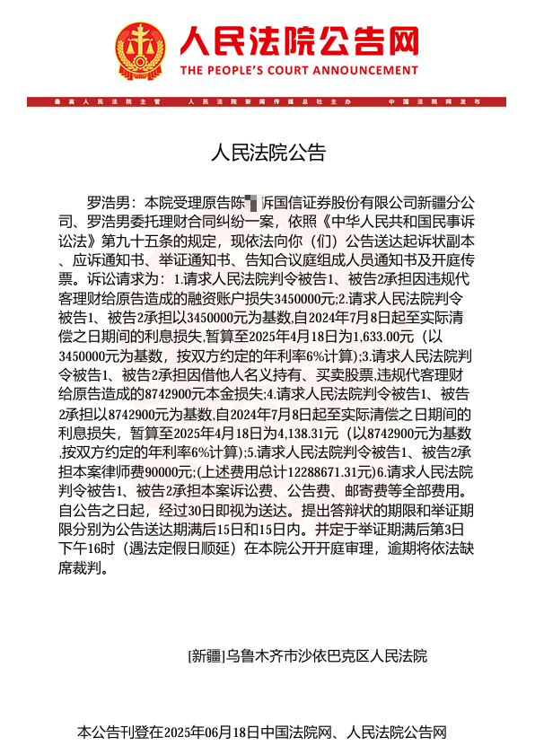 6月18日,新疆维吾尔自治区乌鲁木齐市沙依巴克区人民法院就原告陈某诉国信证券新疆分公司、罗浩男委托理财合同纠纷一案,向罗浩男公告送达起诉状副本、应诉通知书、举证通知书、告知合议庭组成人员通知书及开庭传票。