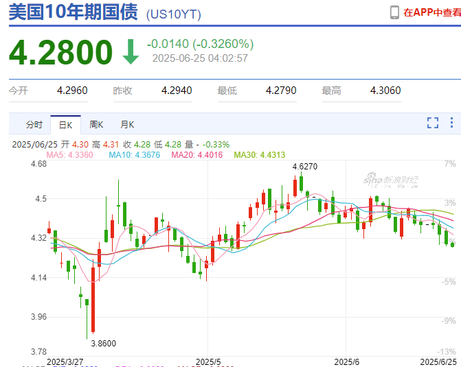 虽然鲍威尔不同意在7月份会议降息,但市场却加大了对年内降息的押注,美国十年期国债收益率跌破4.3%关口。摩根士丹利预计美联储将在2026年七次降息,从3月开始,最终利率料达到2.5%-2.75%。