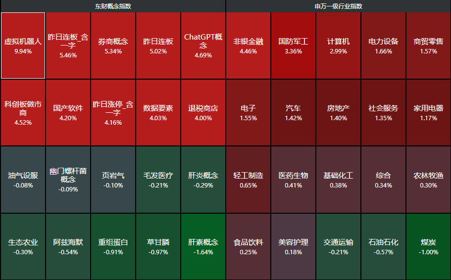 分行业来看,非银金融、国防军工、计算机、电力设备、商贸零售等行业领涨,煤炭、石油石化、交通运输三大行业下跌。