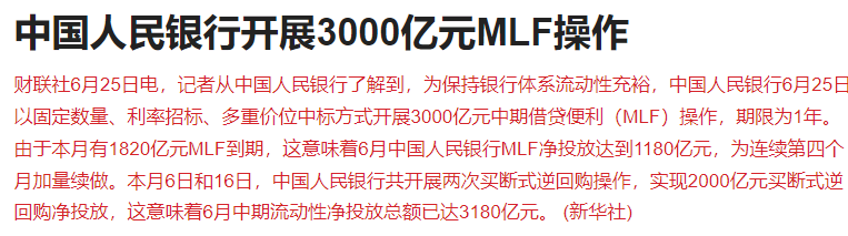 中国人民银行6月25日以固定数量、利率招标、多重价位中标方式开展3000亿元中期借贷便利(MLF)操作,期限为1年。由于本月有1820亿元MLF到期,这意味着6月中国人民银行MLF净投放达到1180亿元,为连续第四个月加量续做。本月6日和16日,中国人民银行共开展两次买断式逆回购操作,实现2000亿元买断式逆回购净投放,这意味着6月中期流动性净投放总额已达3180亿元。