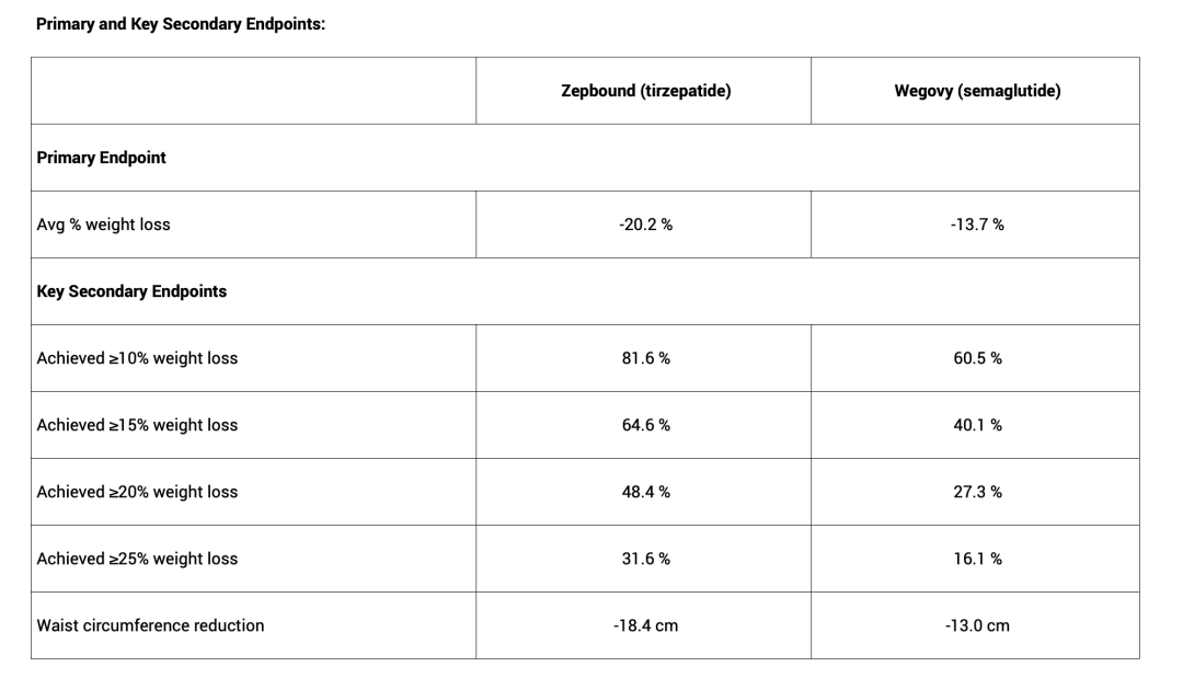 在药效方面,替尔泊肽在减重领域的药效优于司美格鲁肽。礼来设计并开展了替尔泊肽与司美格鲁肽的头对头临床试验SURMOUNT-5,并于今年5月公布了详细结果,数据显示替尔泊肽无论是主要终点数据还是5个次要终点数据均优于司美格鲁肽,简单地说使用替尔泊肽72周时间能够多减8公斤,这对替尔泊肽的临床推广颇为有利。