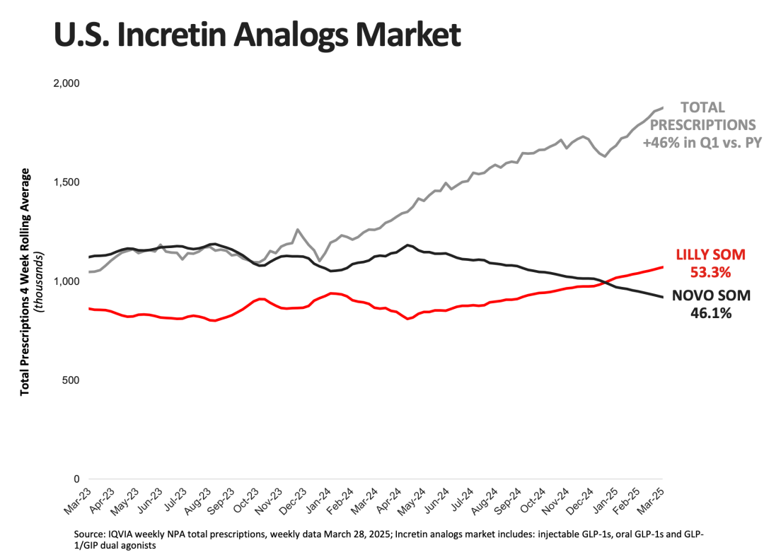 替尔泊肽在2022年在美国获批上市后,处方量持续快速增长,而且增速水平远超同期的司美格鲁肽,由此驱动替尔泊肽的市占率快速提升。IQVIA数据显示,截至2025Q1,礼来(包含替尔泊肽、度拉糖肽等相关产品)在美国肠促胰岛素类似物市场的总处方量占比已经提升至53.3%,并超越主要竞争对手诺和诺德。替尔泊肽作为后发竞品,其处方量的放量速度远超司美格鲁肽,背后存在多方面的原因。