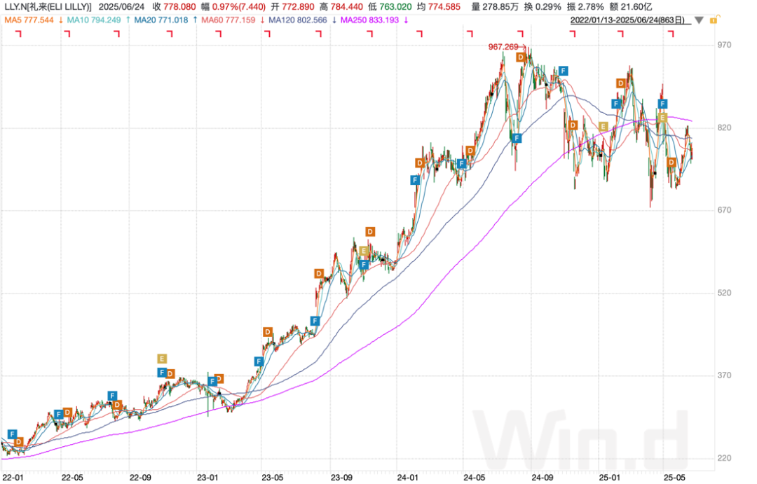 替尔泊肽在2022年5月获批上市,礼来股价从彼时至今的涨幅高达180%(截至6月24日),区间最大涨幅更是超过了240%。从基本面来看,根据2025Q1的销售数据,替尔泊肽(包含减重和降糖)的销售收入约占全公司同期总收入的39%,已成为礼来业绩的支柱,由此可见,替尔泊肽近年来的销售放量对公司估值的支撑可以说是功不可没。