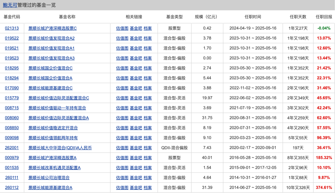 可以看到,无论是管理时间1年、2年、3年、4年、5年、8年、10年,还是仅仅管理197天,鲍无可管理产品都获得正收益,管理时间越长正收益也就越高,这才是基民心中真正的“明星基金经理”。