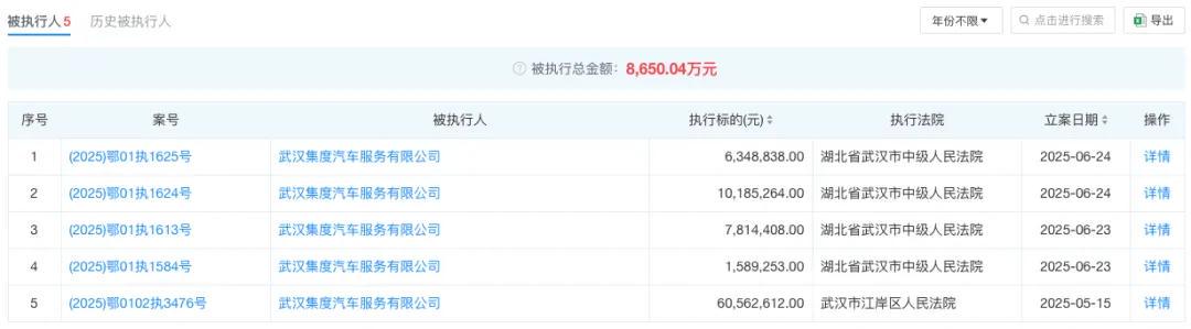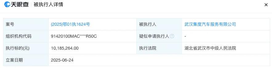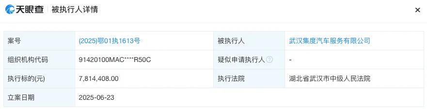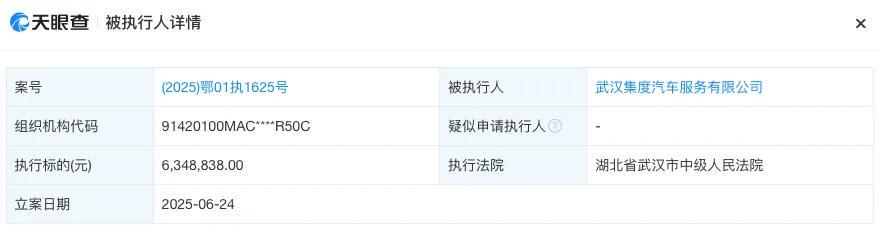 天眼查信息显示,6月23日和6月24日,武汉集度汽车服务有限公司新增4条被执行人信息,执行标的分别为158.93万元、781.44万元、1018.53万元、634.88万元,合计2593.78万余元,执行法院均为湖北省武汉市中级人民法院。