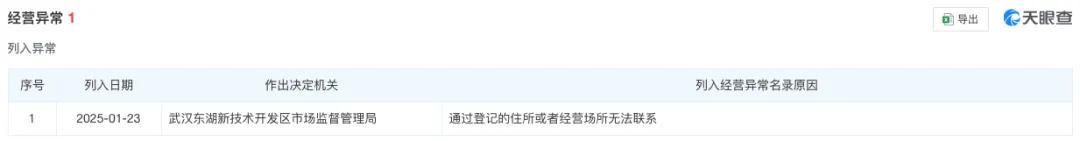 天眼风险信息显示,截至发稿前,武汉集度汽车服务有限公司共存在5条被执行人信息,被执行总金额为8650.04万元;同时,该公司还面临多起开庭,目前开庭公告为60条,案由多为买卖合同纠纷、建设工程合同纠纷、服务合同纠纷、仲裁程序中的财产保全。今年1月23日,因该公司通过登记的住所或者经营场所无法联系,被武汉东湖新技术开发区市场监督管理局列入经营异常名录。