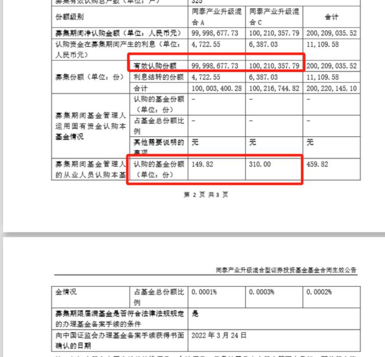 其二,在同泰产业升级成立时,同泰基金诚意满满、斥巨资、大手笔自购,分别买入了约150份A份额和310分C份额,合计约460份。
