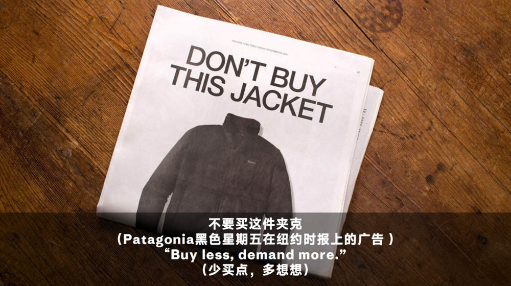 1.2011年,Patagonia在黑色星期五那天的《纽约时报》上刊登了一则挑衅性的广告——“不要买这件夹克”,告诉人们减轻对环境的影响,并减轻消费主义倾向。