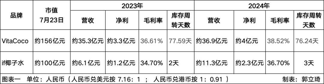 我们将if椰子水与2021年上市的VitaCoco的财务数据做一组简单对比。两家公司目前的市值差不多都处在100亿元的体量,从2023年、2024年两年数据来看,VitaCoco市值略高,从营收上看,VitaCoco在2023年的营收是if椰子水的近6倍,到了2024年差距缩小到3倍多,净利之间的差距从2亿多元人民币缩小至约1.7亿元人民币,但两家公司过去两年的毛利率水平却相差不大,都在一个百分点左右。另外就是if椰子水的库存周转天数仅为2到3天(见图表一)。