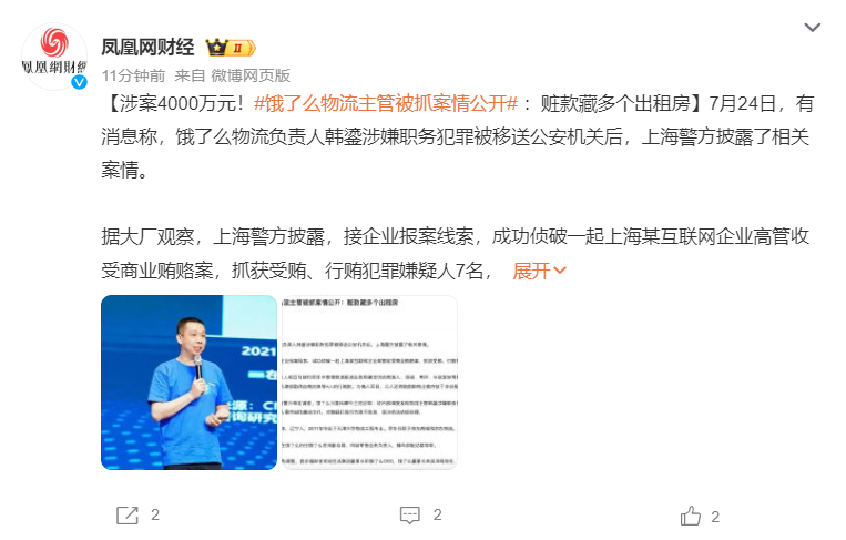 6月,有媒体报道称饿了么物流负责人、原CEO韩鎏在上海办公室被警方带走,初步原因是涉及供应链利益输送。