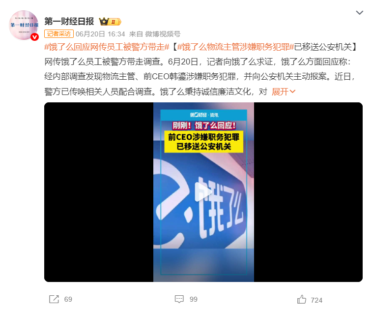 对此,饿了么方面回复称,通过内部调查发现物流主管韩鎏涉嫌职务犯罪,并向警方主动报案,警方已传唤相关人员配合调查。饿了么秉持诚信廉洁文化,对触碰红线行为绝不姑息,坚决依法依规处理。