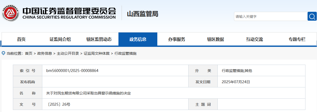 中新经纬7月24日电 据山西证监局网站24日消息,山西证监局对民生期货有限公司(下称“民生期货”)采取出具警示函措施。