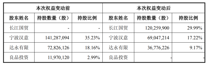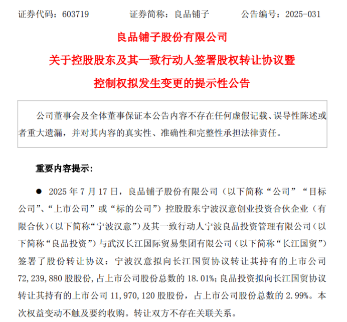 7月17日,良品铺子公告称,控股股东宁波汉意及其一致行动人宁波良品,拟以12.42元/股的价格,分别向长江国贸协议转让良品铺子7224万股及1197万股的股份,分别占据良品铺子总股本的18.01%和2.99%,总价10.46亿元。