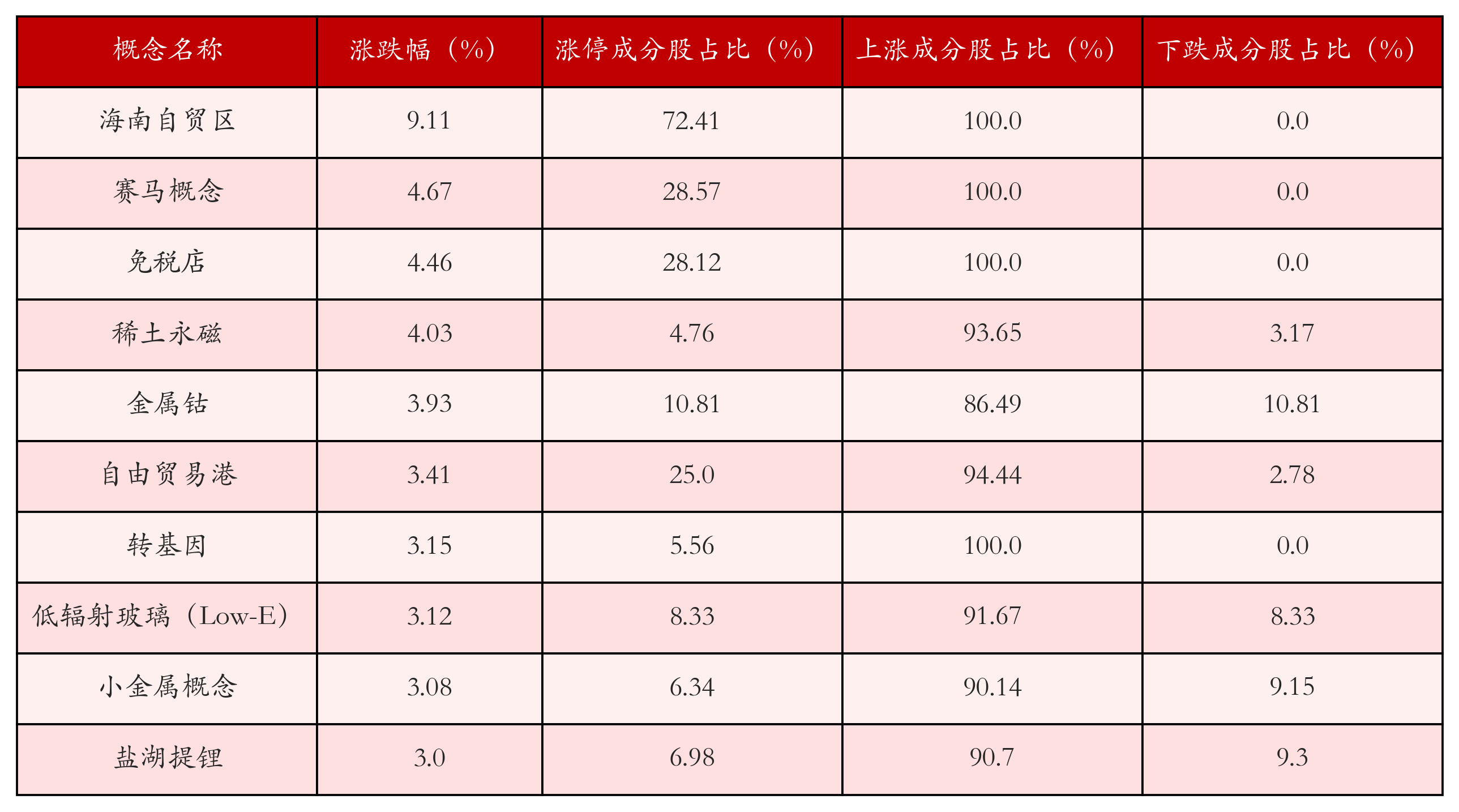 根据A股概念涨跌幅与所对应的股票池综合分析,涨幅靠前的三个概念板块分别为:海南自贸区、赛马概念与免税店。排名前10位的概念板块相关数据见下表: