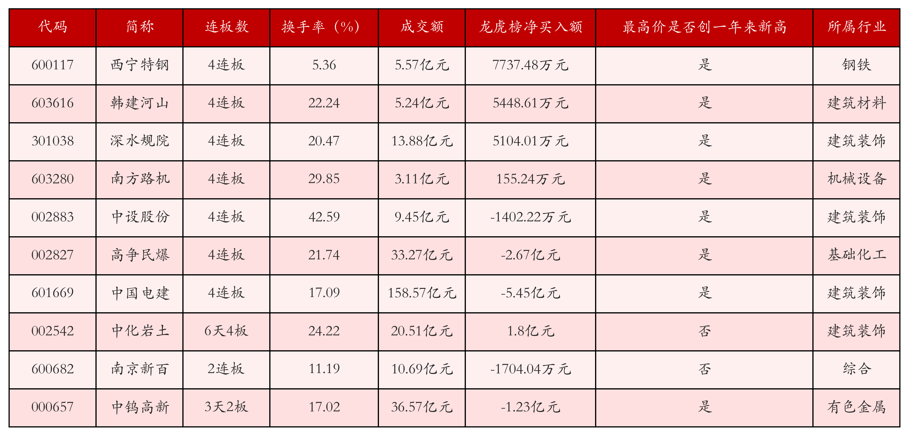 截至7月24日收盘,上证综指上涨0.65%,收于3605.73点,深证成指上涨1.21%,收于11193.06点,创业板指上涨1.5%,收于2345.37点。今日沪深两市A股共计78只涨停,综合当前连板数以及当日龙虎榜数据,其中较为强势的前三只个股分别为:西宁特钢(600117)、韩建河山(603616)与深水规院(301038)。今日强势个股前10位具体数据见下表:
