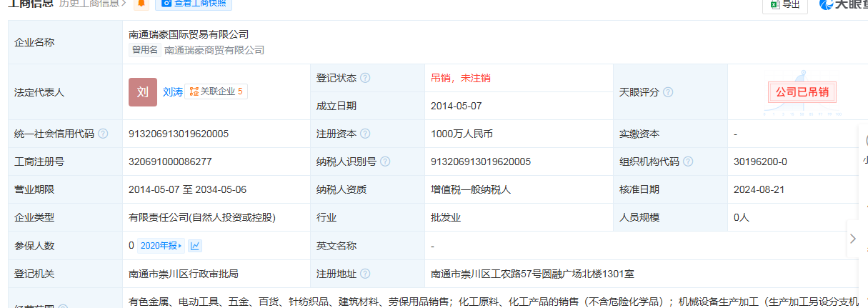 另外,上述提及的南通瑞豪,天眼查APP显示,该公司已于2024年8月21日被吊销。此前有媒体前往南通瑞豪注册地址,但该地址并无办公迹象。