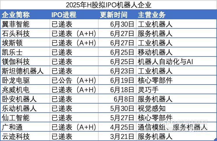 据记者不完全统计,今年以来,至少有13家机器人公司向港交所递交上市申请,这批拟上市的企业中,有9家在今年6月递交了上市申请。