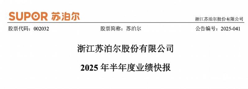 7月24日,家电上市公司苏泊尔发布2025年半年度业绩快报,营业收入约114.78亿元,同比增加4.68%;归属于上市公司股东的净利润约9.4亿元,同比减少0.07%;基本每股收益1.18元,同比减少0.08%。