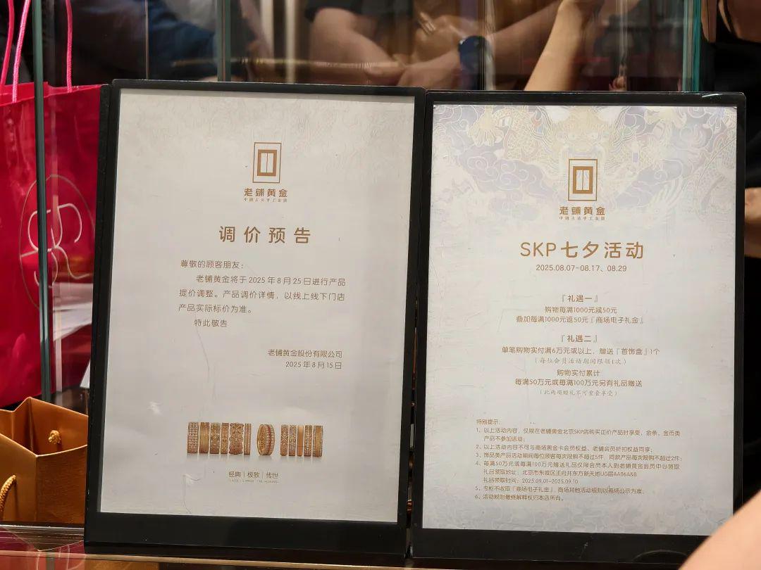 “25日起就要涨价”是消费者们对老铺黄金趋之若鹜的原因之一。此外,恰逢北京skp商场的“七夕活动”,老铺黄金推出购物每满1000元减50元,叠加每满1000元返50元/商场电子礼金等优惠。