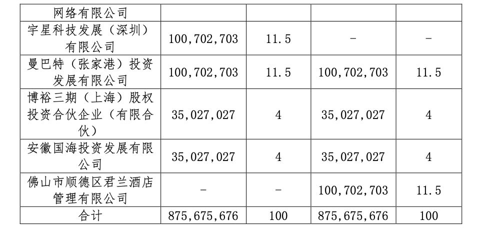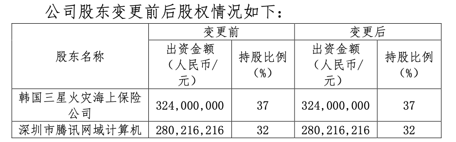 增资后,韩国三星火灾海上保险持股比例维持在37%,为第一大股东;深圳市腾讯网域计算机网络持股32%,为第二大股东;君兰酒店与曼巴特(张家港)投资发展各持股11.50%,并列第三大股东。