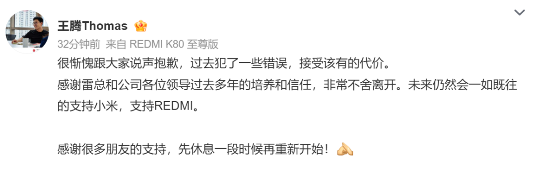 【导读】小米中国区市场部总经理王腾被辞退,本人发文致歉