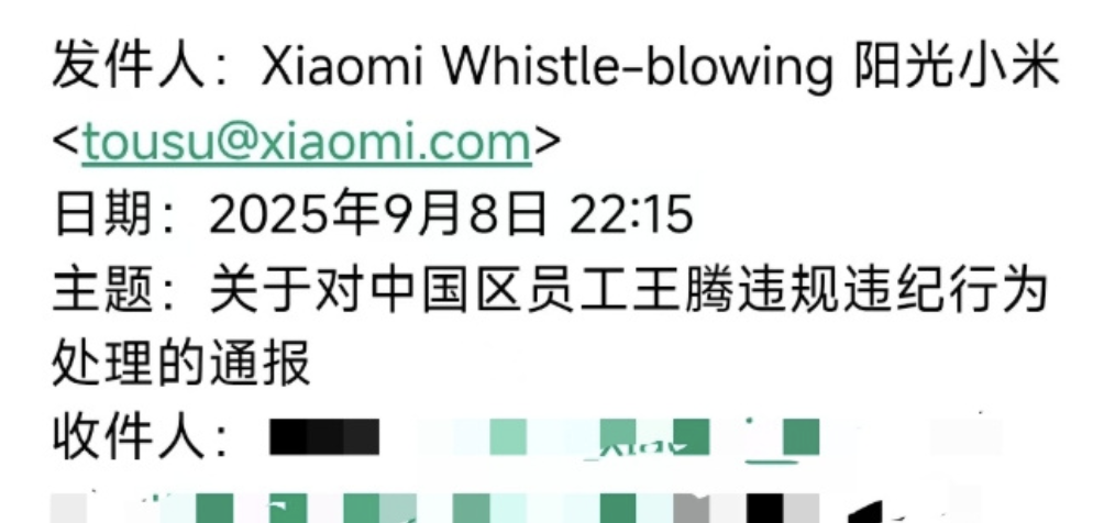 9月8日深夜,根据一封标注时间为2025年9月8日22:15、由小米集团职业道德委员会发出的邮件,小米中国区市场部员工王腾,泄露公司机密信息,且存在利益冲突等严重违规违纪行为。根据《小米集团员工违规违纪行为处理办法》《小米集团诚信廉洁守则》等制度规定,公司决定给予王腾辞退的处分。