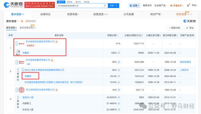 天眼查显示,娃哈哈食品公司分别由杭州娃哈哈宏振投资有限公司持股51%,娃哈哈集团持股39%,浙江娃哈哈实业股份有限公司持股10%。