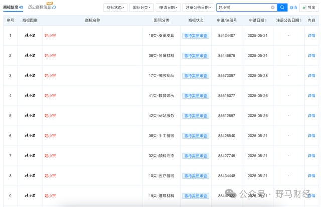 天眼查显示,2025年5月21日-28日,宏胜饮料集团注册了大量“娃小宗”商标,涉及行业十分广阔,包括医药、布料床单、餐饮住宿、金融物管、化学原料、绳网袋篷、建筑管理、网站服务等。以上共有43项商标,目前正处于“等待实质审查”阶段。