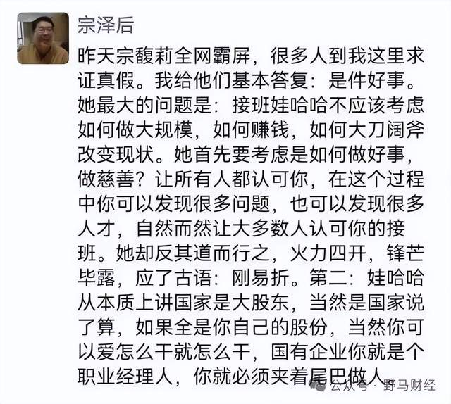 当时,宗庆后胞弟宗泽后在在朋友圈中写道,“她(宗馥莉)最大的问题是:接班娃哈哈不应该考虑如何做大规模,如何赚钱,如何大刀阔斧改变现状。她首先要考虑是如何做好事做慈善?让所有人都认可你,在这个过程中你可以发现很多问题,也可以发现很多人才,自然而然让大多数人认可你的接班。她却反其道而行之,火力四开,锋芒毕露,应了古语:刚易折。”