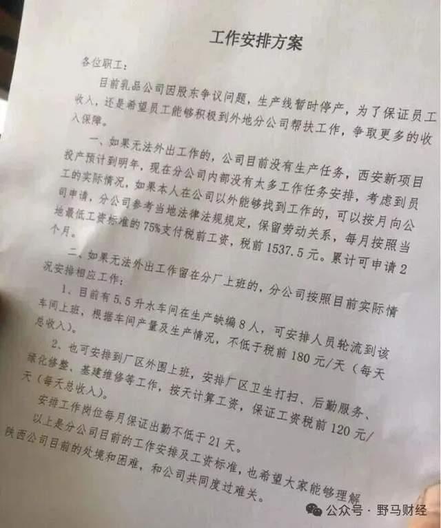 据新媒体“红星资本局”援引陕西娃哈哈乳品有限公司15年老员工投诉称,自2月16日停产至今,员工的收入开始缩减。正常生产时,每月到手有5000-6000元,如今只有1000多元。公司安排他们调配至内蒙、武汉和西宁等地的娃哈哈其他分公司工作,或者去做厂区后勤工作,如食堂、门卫和绿化等。对于无法外出工作的,公司目前没有生产任务,可以按照当地最低工资标准的75%给予1573.5元/月的税前工资,累计可以申请2个月。至于停产原因,《工作安排方案》明确写了是因为股东争议问题,生产线暂时停产。目前,这些员工组织了维权群,也在向相关方面反映诉求。
