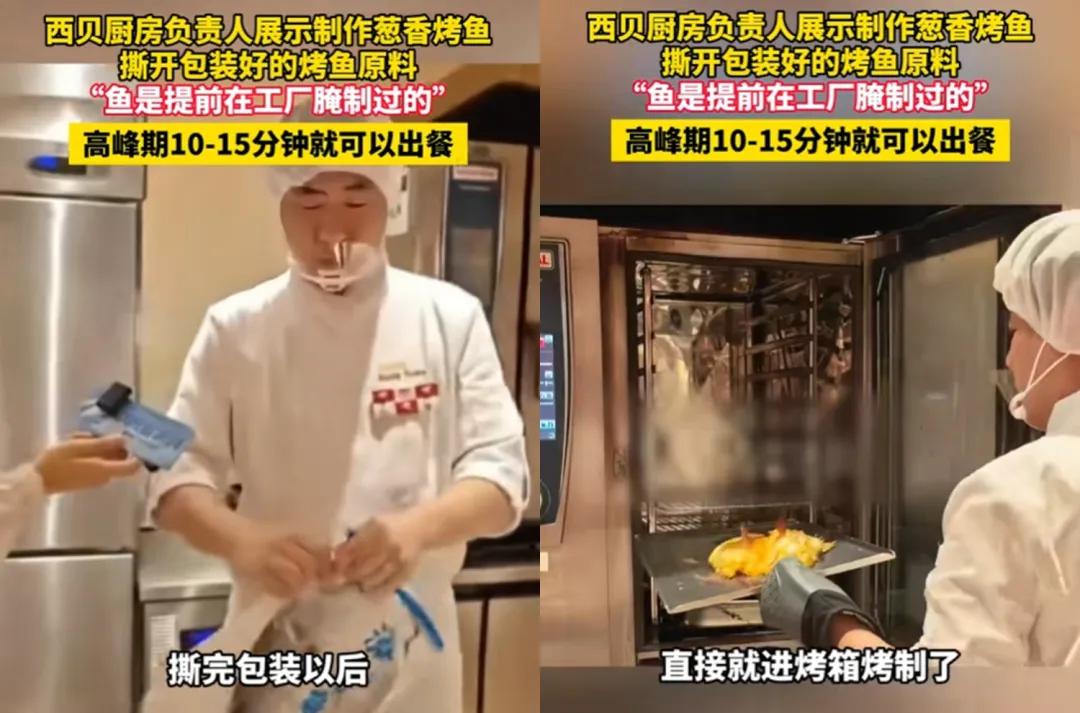 在西贝直播间,厨师制作“葱香烤鱼”,掏出一条提前腌制好的冷冻鱼,放进烤箱里加热一下,然后倒进盘子里,直接送到餐桌上,卖价是89元。